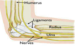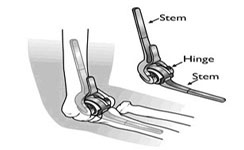 In total elbow replacement surgery, the damaged parts of the humerus and ulna are replaced with artificial components. The artificial elbow joint is made up of a metal and plastic hinge with two metal stems. The stems fit inside the hollow part of the bone called the canal.