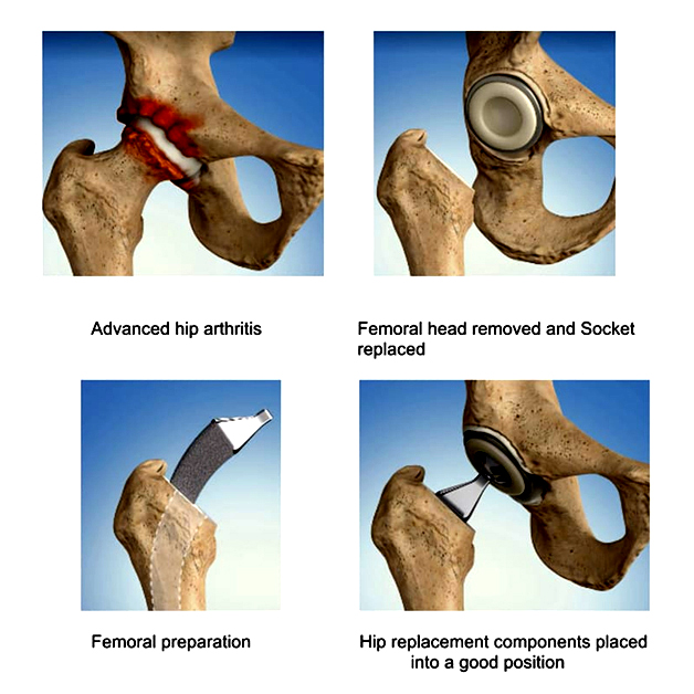 Then the surgeon replaces the head of the femur and acetabulum with new, artificial parts. The new hip is made of materials that allow a natural gliding motion of the joint.