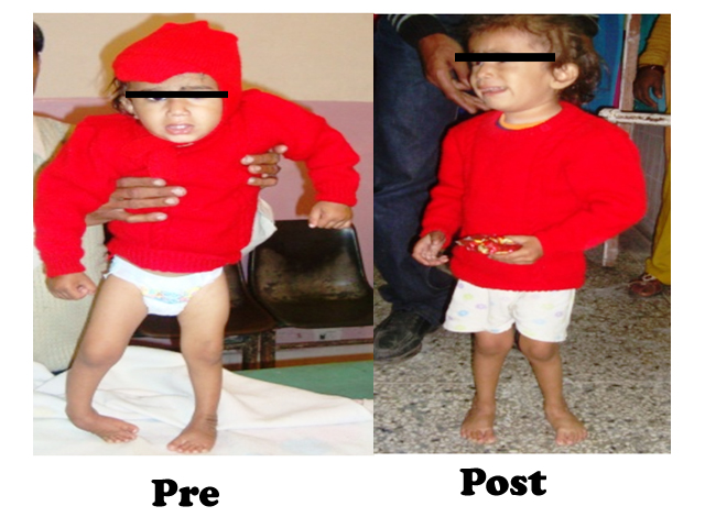 It is very important part of the process and it involves bracing and regular follow up with me to prevent relapse and recurrence in foot. Brace should be applied immediately after the removal of last cast. For first three months brace should be worn for 23 hours and remaining one hour is used for cleaning, exercises.After three months the brace should be worn only at night for 12 hours only when the child is asleep. The provision is made to allow the toddler to walk during day hours. It should be continued for two to four year. No special shoe is required during the day time walking. First follow up visit at 15 days and then every month for six months or till age of 2 years. During this period child’s parents are counseled for continuous application of the brace as according to the protocol otherwise there will be recurrence.